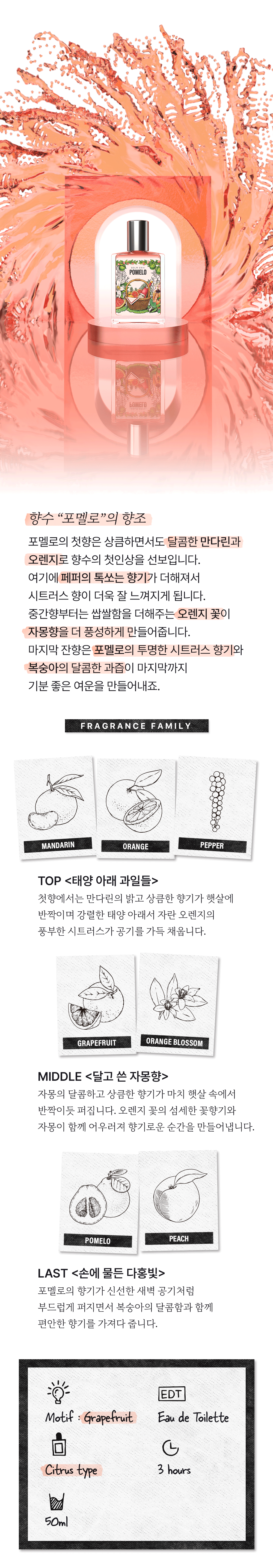 사용방법 : 우리 몸에서 열이 많은 부위인 가슴, 목, 손목, 팔뚝, 안쪽 팔꿈치, 어깨 등에 뿌려주세요. 스프레이 노즐을 7~16cm 떨어진 곳에서 분사해주세요. 필요한 경우에 재분사해 주세요. 색이 있는 향수는 이염, 변색의 우려가 있기 때문에 흰색 옷 위에는 직접적으로 뿌리지 않는 것을 추천해 드립니다.